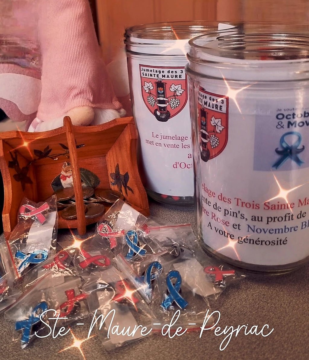Le Jumelage des Trois Sainte Maure propose à la mairie des pin's au profit d'Octobre Rose et de Novembre Bleu.