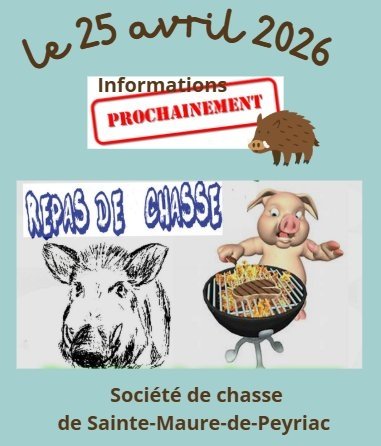 La Société de chasse de Sainte-Maure-de-Peyriac organise un repas de chasse prévu le samedi 25 avril 2026 à la Salle des Fêtes Henri Duffau.