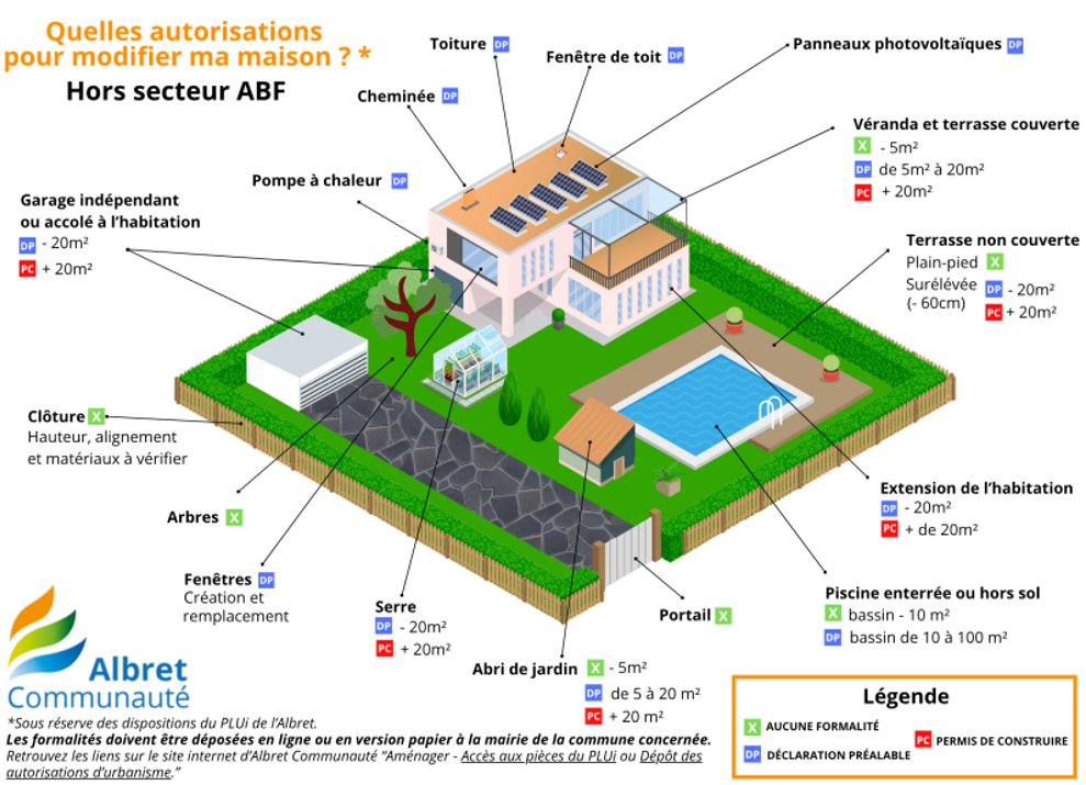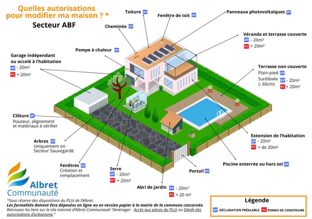 Les formalités varient en fonction de la nature des travaux et de votre secteur d'habitation (secteur protégé par les Architectes des Bâtiments de France ou non). CF. schémas.