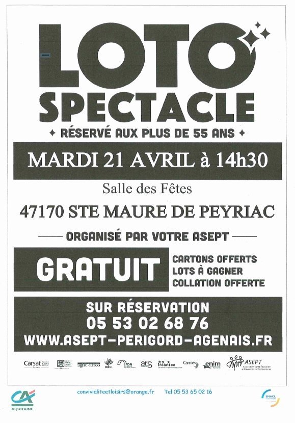 LâAssociation ConvivialitĂ© et Loisirs a le plaisir dâinviter les personnes de plus de 55 ans Ă un Loto Spectacle placĂ© sous le signe de la bonne humeur et du partage.